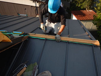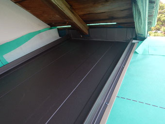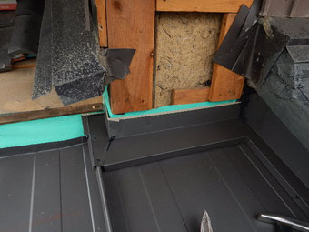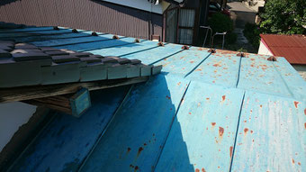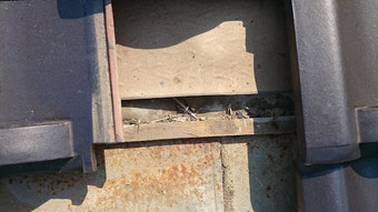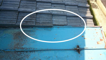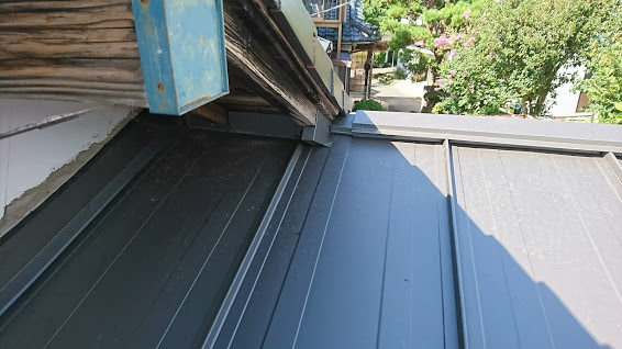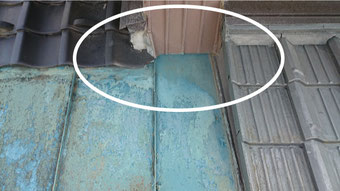 瓦屋根と板金屋根の取り合い部です。ここも雨漏りしやすい箇所となります。