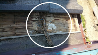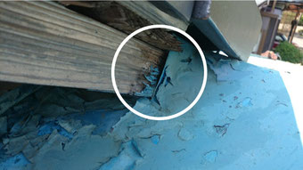 雨漏りの原因として考えられる箇所です。屋根垂木を伝ってきた雨水が隙間から入り込んでいると思われます。